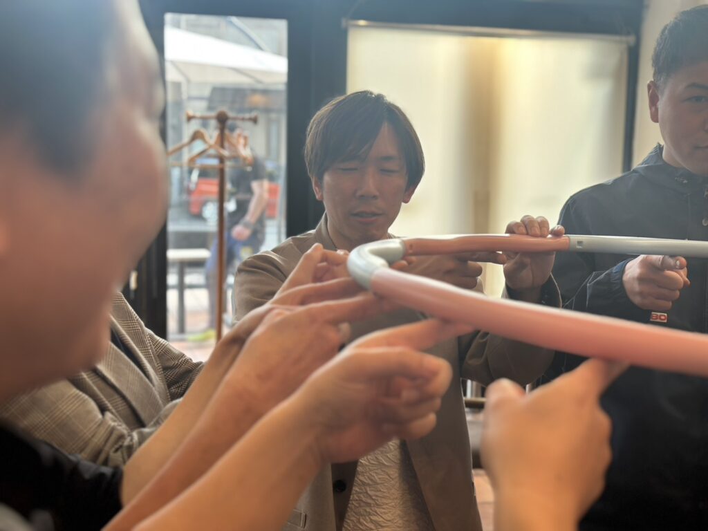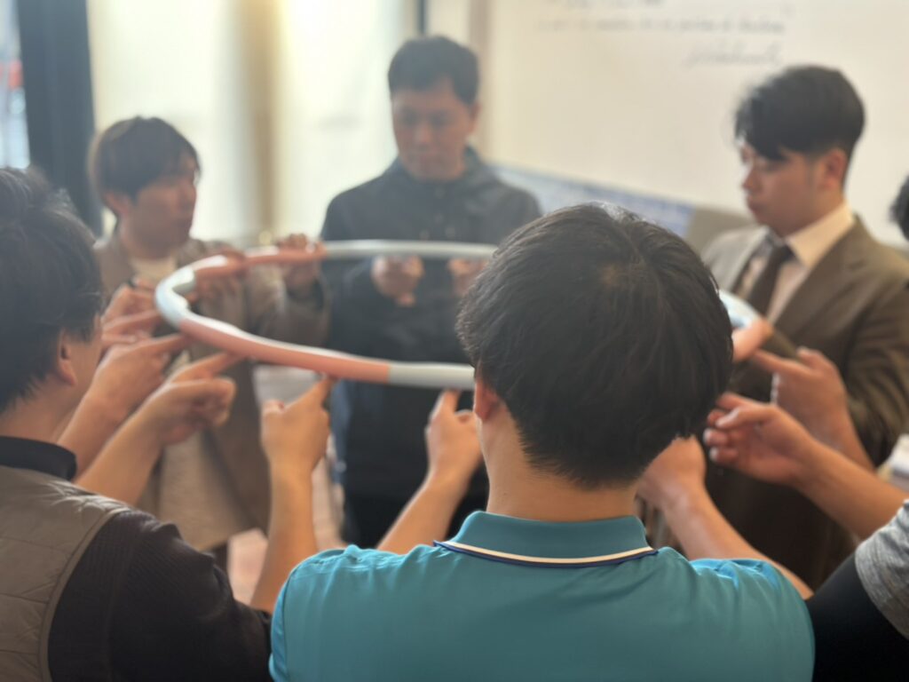 写真に写っているのは、グループ全員で一つのフラフープを指に乗せ、落とさないようにコントロールするワークです。これが想像以上に難しく、「もう少し下げて!」「こっちが早いかも!」と、自然と声を掛け合う姿が見られました。