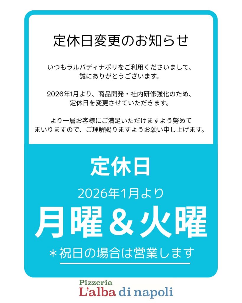 お知らせ【ラルバディナポリ】2026年1月より定休日変更のお知らせ